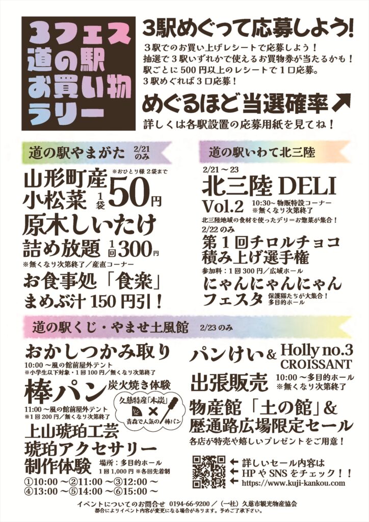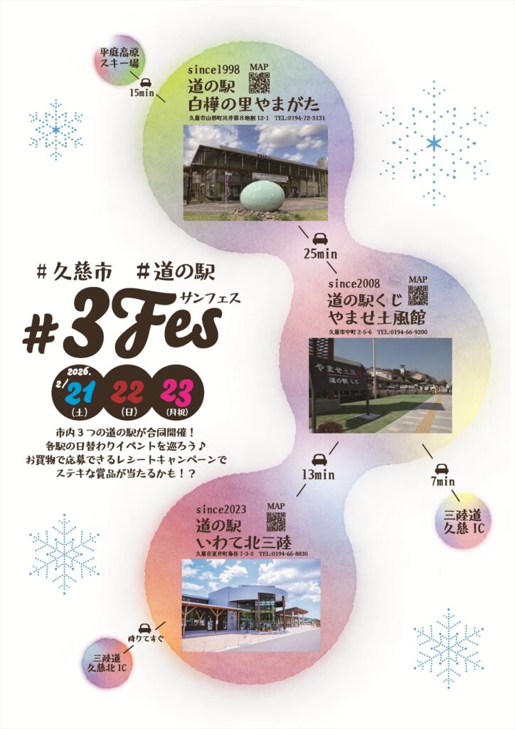久慈市内の3カ所の道の駅「やまがた」「くじ」「いわて北三陸」の合同イベント「#3フェス(さんふぇす)」が開催されます。3駅が日替わりでメイン会場となり、限定セールや体験メニューなどが予定されています。イベント期間中の3駅のお買い上げレシートで応募できるお買物ラリーでは、抽選で3駅いずれかで使用できるお買物券が当たります。是非ご応募下さい。