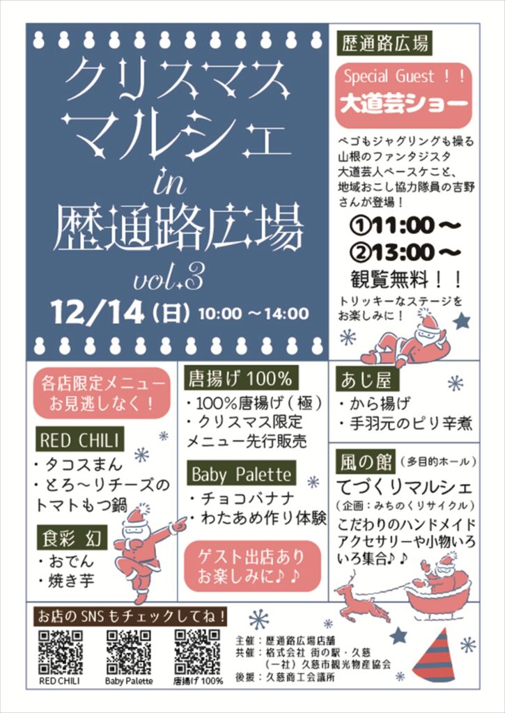 道の駅くじの歴通路広場でクリスマスイベントが開催されます。限定メニューやゲスト出店が予定されています。風の館では「てづくりマルシェ」が同時開催されます。